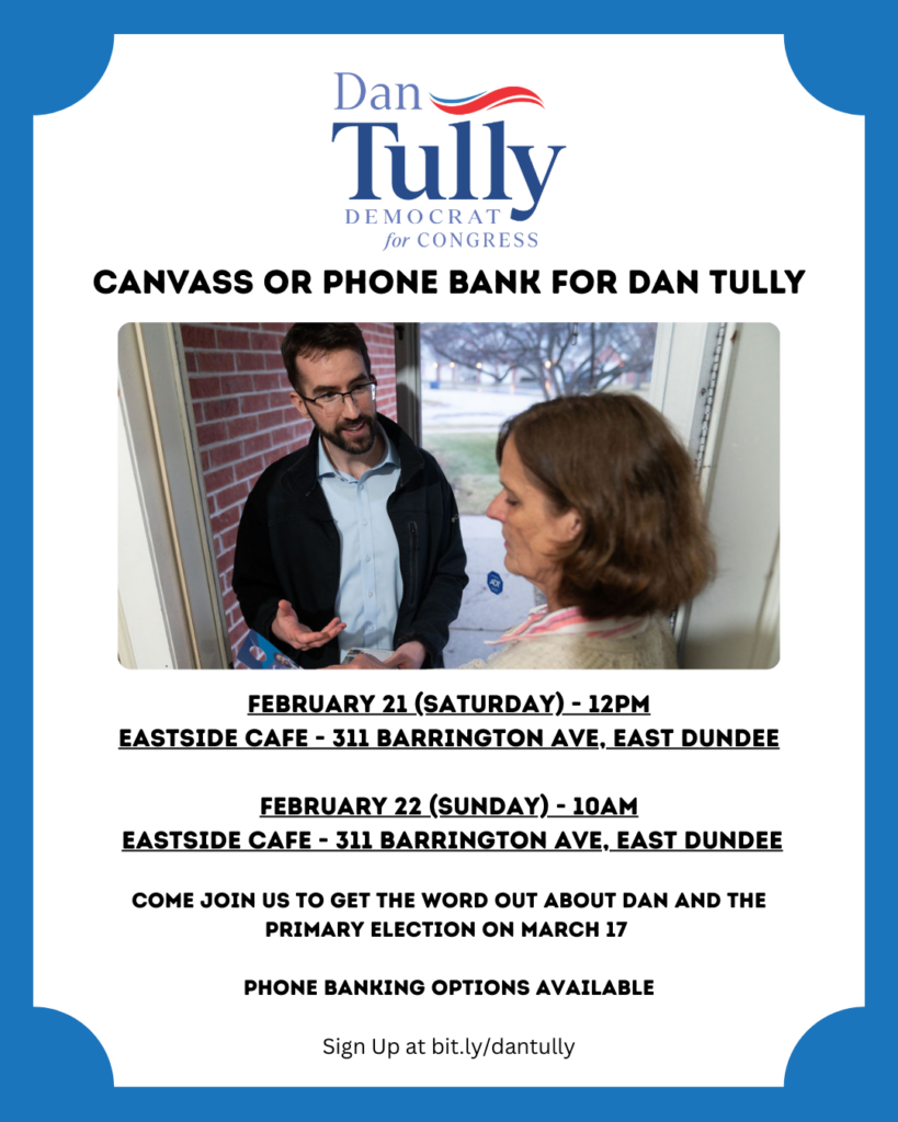 Canvass for Tully at Noon on Feb 21st & 10 AM on Feb 22nd February 19, 2026 MommaMcJ At Eastside Cafe, 311 Barrington Ave, East Dundee Phone Bank Options are available Sign up Here