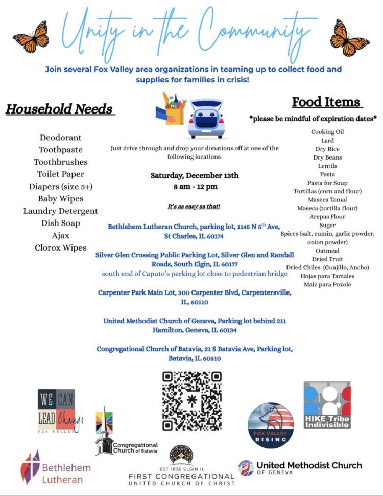 Join We Can Lead Change, Indivisible Fox Valley Rising, First Congregational United Church of Christ and HIKE Indivisible Elgin to collect food and supplies for families in crisis.