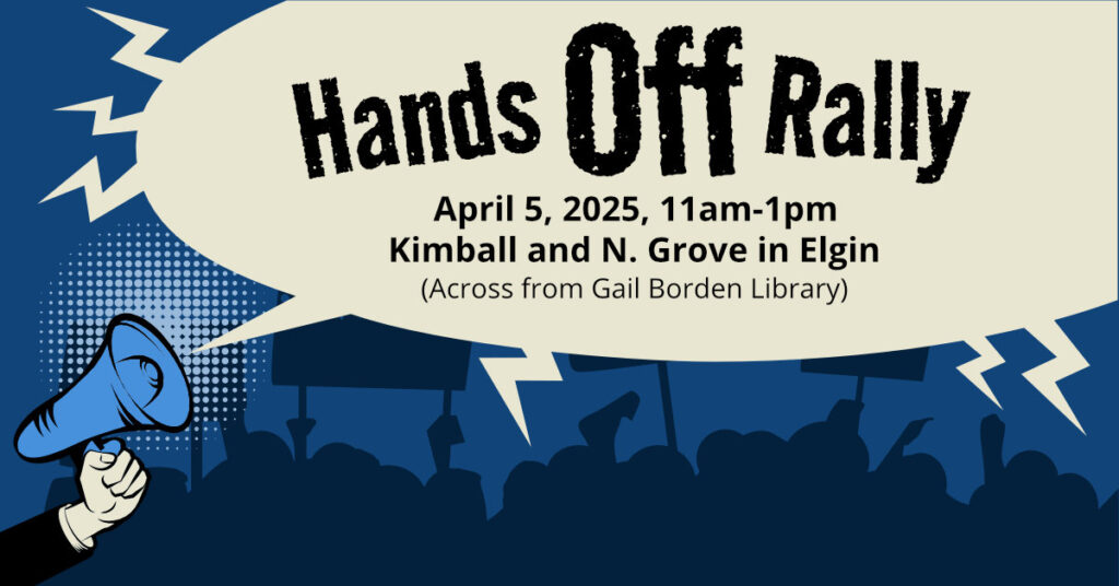 - APR 5 – Elgin Township Democrats “Hands Off Rally” Kimball St. and Grove Ave. 11 AM – 1 PM