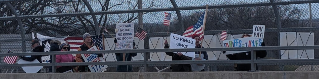 You’re Invited to join the HIKE Tribe to wave signs and flags while 60,000 cars (and who knows how many passengers) pass our big NO WAR and NO KINGS signs on state highway 25 and Interstate 90.