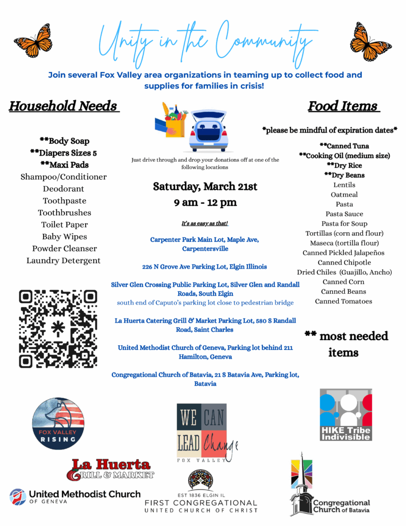 With SNAP cuts, millions in Illinois are losing food assistance. Local pantries expect a surge in need — and they need our help. We are joining We Can Lead Change, Fox Valley Rising, HIKE Indivisible Elgin, La Huerta Grill & Market, Congressional Church of Batavia, First Congressional Church of Christ, and United Methodist Church of Geneva and teaming up to collect food and supplies for families in crisis. Just drive through and drop off your donations. It’s as easy as that!