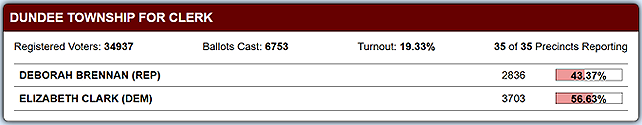 Candidate Elizabeth Clark is leading by 13.26% in the race for Dundee Township Clerk!