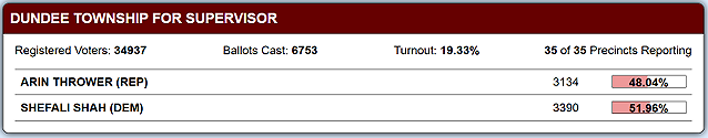 Candidate Shefali Shah is leading by 3.92% in the race for Dundee Township Supervisor!