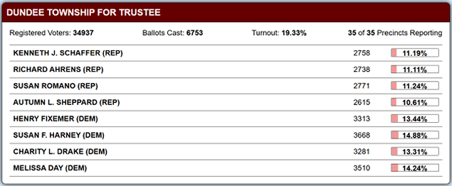 Candidates Henry Fixmer, Sue Harney, Charity Drake, and Melissa Day are each leading by at least 2% in their race for Dundee Township Trustees.